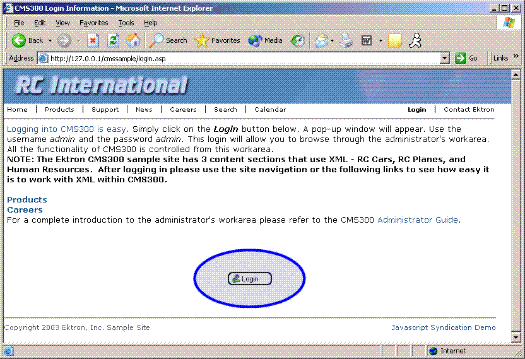 Clicking the login button opens a login window in which a user enters the username and password. Upon successful completion, the user is logged in to the Ektron CMS400.NET Web site.