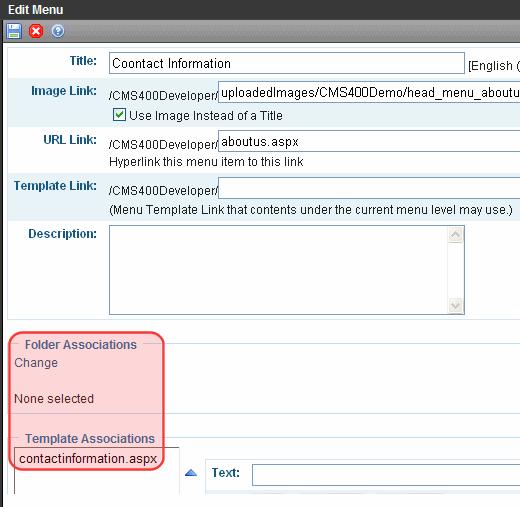 The Advanced Settings on the Edit Menu screen has Folder Associations and Template Associations sections (see image below). Any folders or templates currently assigned to the menu appear. You can use this section of the screen to add new templates/folders or remove existing ones.