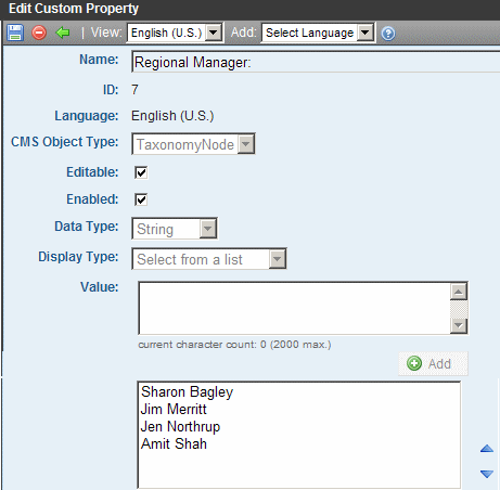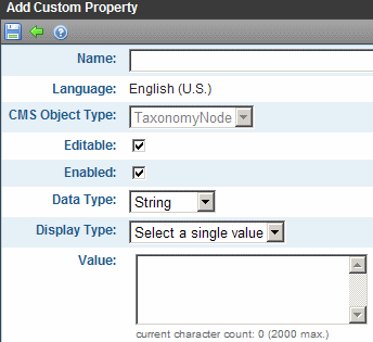 Note: You cannot edit the ID, Language, CMS Object Type, Data Type, or Display Type fields. If you need to change these fields, delete the custom property and create a new one.