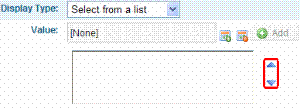 In the top field, insert a value then click Add ( If you want to edit the order of the values, use the up/down arrows (circled above). Note: If Editable is checked and you insert several values, the user applying the custom property can choose the value. If Editable is not checked, the first value is applied to the custom property. |