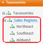 For example, your organization manages a nationwide chain of retail stores. You create a Sales Region taxonomy, where each category represents a different geographic region. Sample categories are northeast, southeast, midwest (as shown below).