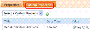 Check this box to allow the user who is applying this custom property to choose a value or edit the default value. Uncheck the box if the user cannot choose or edit the value. In this case, he is only applying the property. If a property is not editable and has several values (type string: select from list or boolean), only the first or selected value is applied to the property. Example of an Editable Custom Property Assume you manage auto parts stores and want a custom taxonomy property to indicate if a car can be repaired at a facility. You create a property named Repair Services Available, and make it boolean and editable. Then, the person applying that custom property to a taxonomy category can choose Yes or No to indicate if repair services are available.